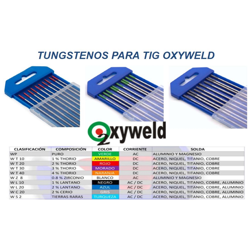 La utilización del tungsteno como electrodo para la soldadura TIG, se debe a que es el metal de mayor punto de fusión (3410ºC), es una de los accesorios básicos para conseguir el arco en proceso TIG y poder llevar a cabo un correcto trabajo de soldadura. Existen diferentes tipos de aleaciones para obtener el resultado óptimo en el encendido del arco, la estabilidad del arco y la disminución de la erosión de la punta. El tungsteno azul contiene un 98% de tungsteno y un 2% de lantano. Electrodo de tungsteno no radiactivo, el mejor electrodo para uso general en corriente alterna o corriente continua. Buen arranque de arco y estabilidad. Recomendado para acero al carbono, acero inoxidable y aleaciones de aluminio.
